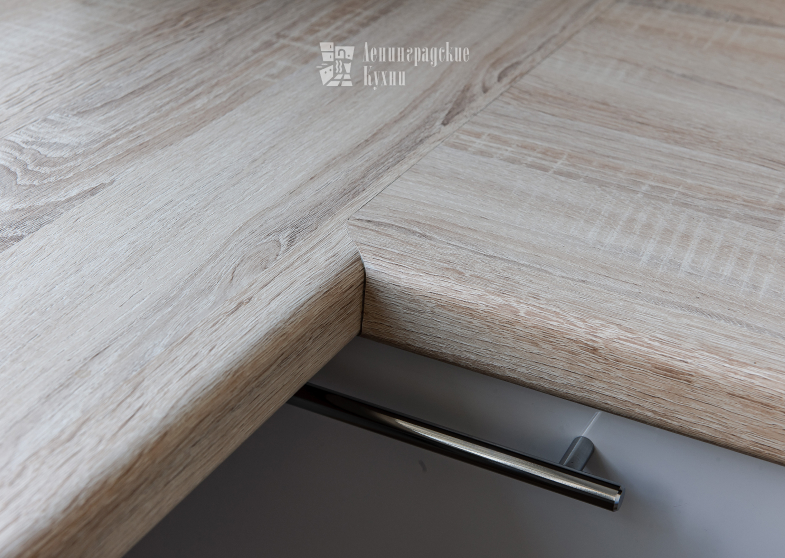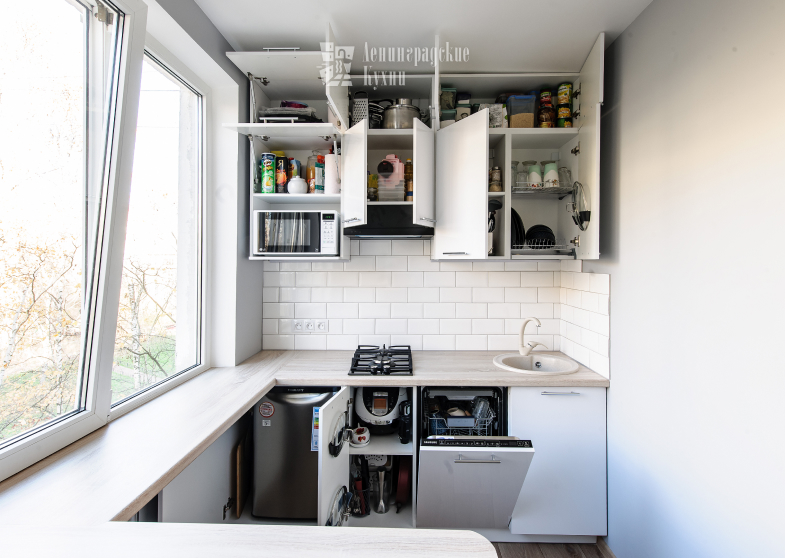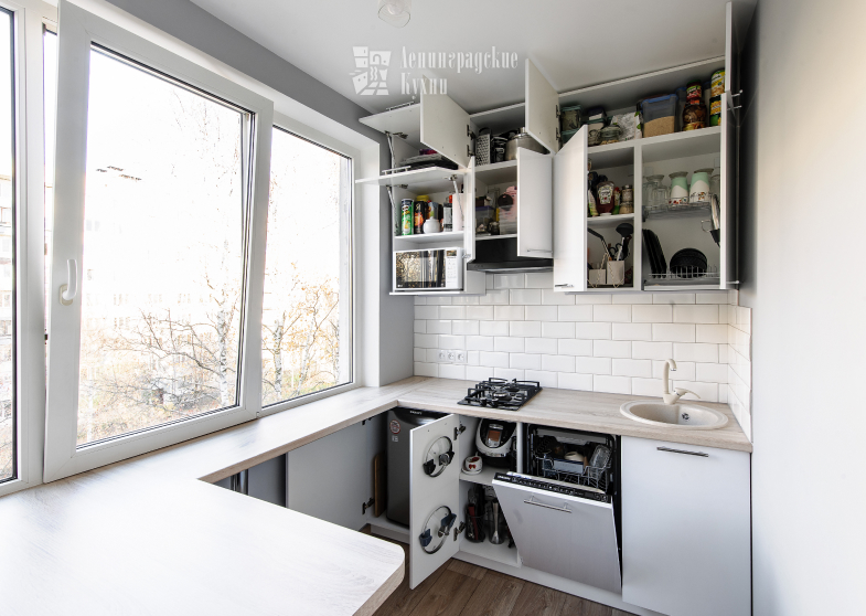 Нестандартное решение по интеграции подоконника в общую кухонную комбинацию позволило увеличить площадь рабочей поверхности, столь необходимую большинству хозяек.