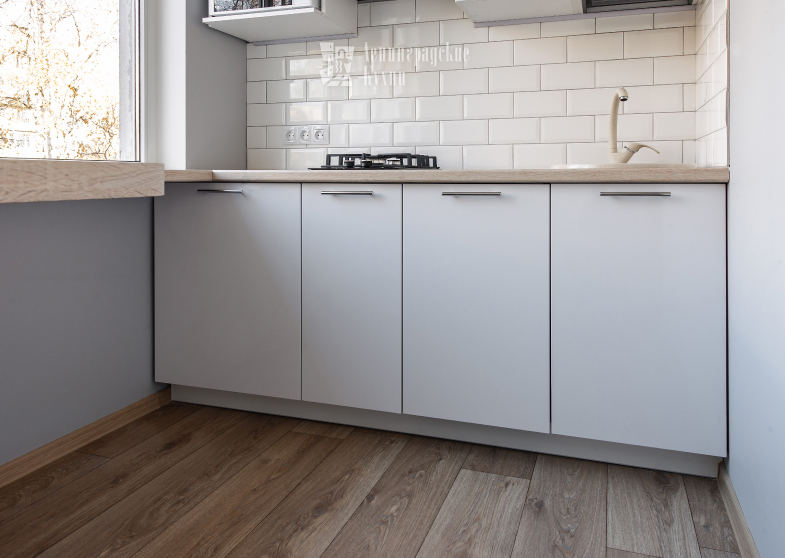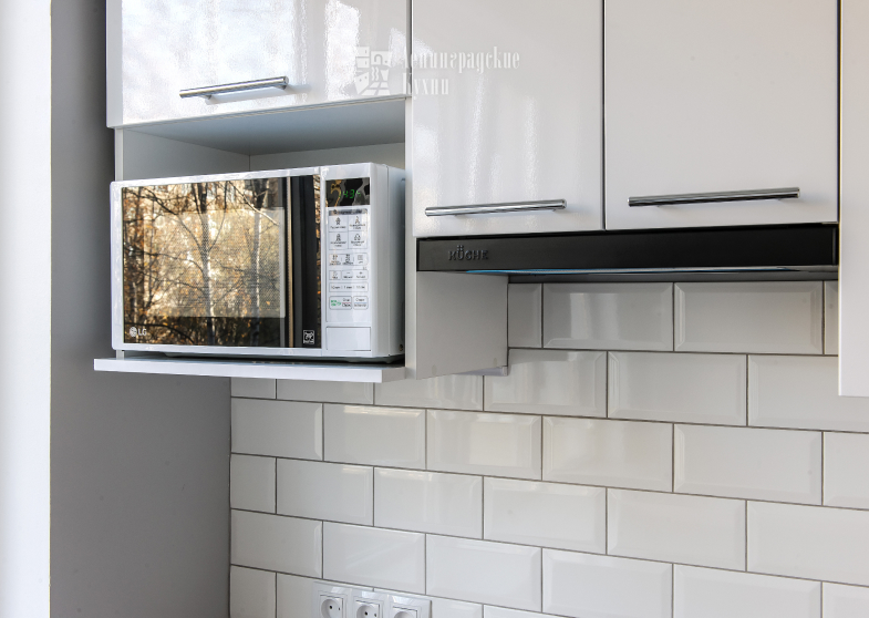 Белые глянцевые декоры и столешницы светлых тонов визуально расширяют небольшое пространство и создают атмосферу комфорта и уюта.