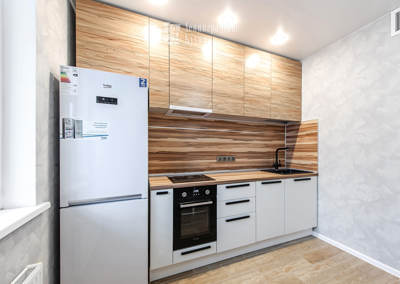 Природные декоры под дерево, использование одинаковой фактуры в столешнице и фартуке, и конечно же, белоснежный цвет, который идеально сочетается с древесными мотивами и много лет не теряет своей популярности.