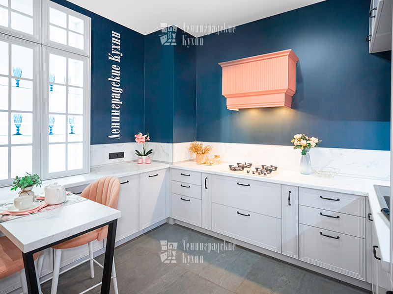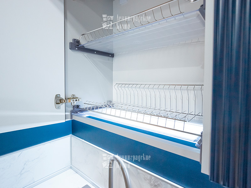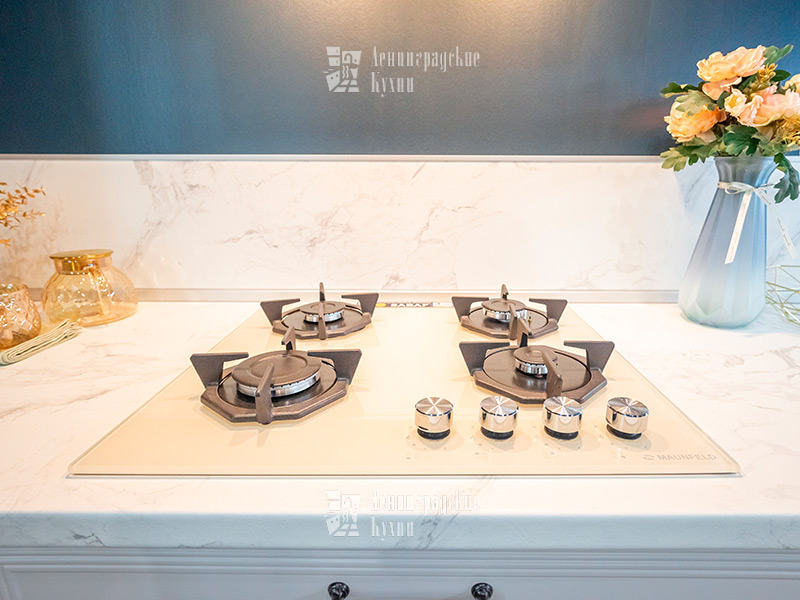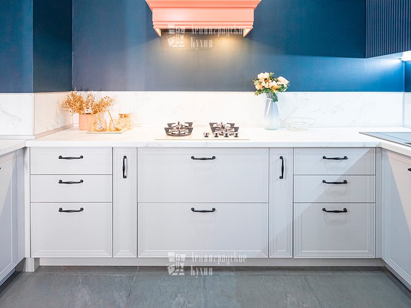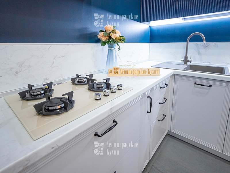 Кухонный гарнитур «Френсис» — это настоящее произведение искусства. Выполненный в стиле «прованс», он сочетает в себе легкость и воздушность, благодаря сочетанию белых с рифлёными синими фасадами.