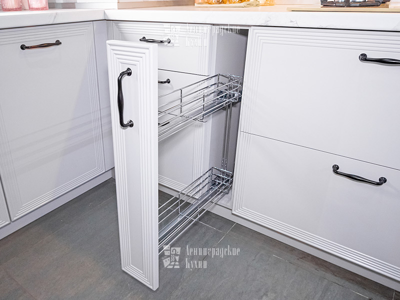 Черные ручки-скобы придают элегантность и изысканность, а встроенная техника делает его функциональным и удобным в использовании. Столешница и фартук «под мрамор» придают кухне особый шарм, подчеркивая ее изысканность и стиль.