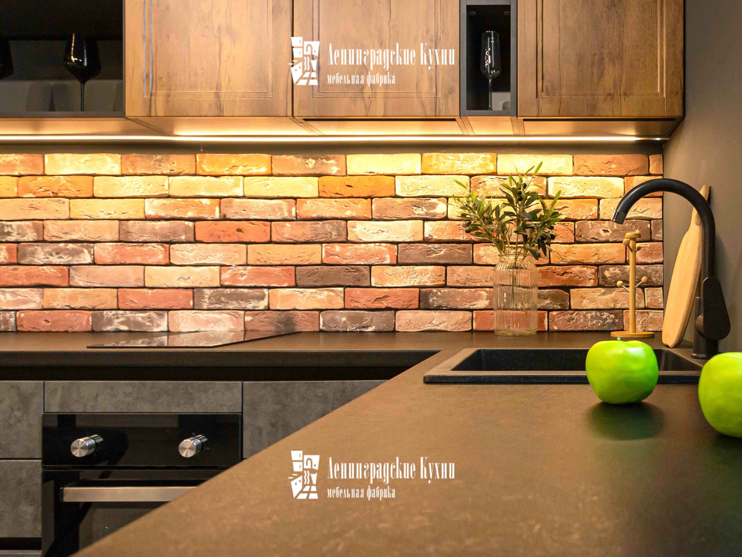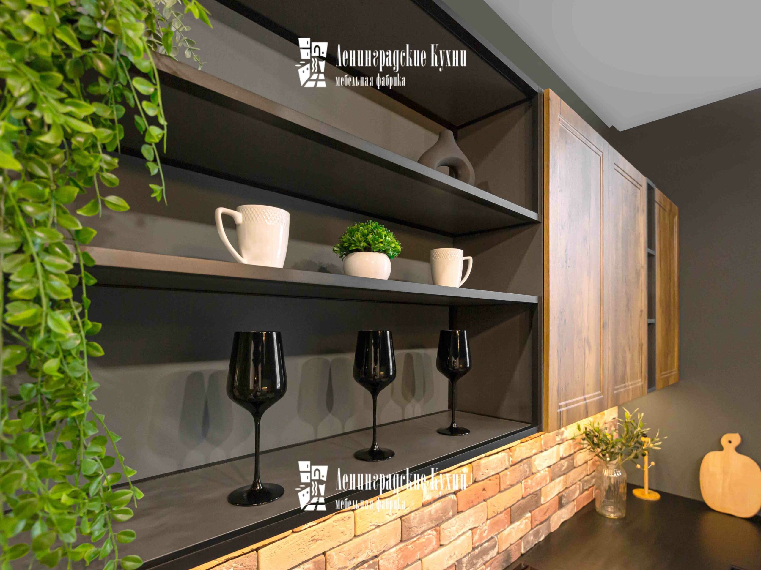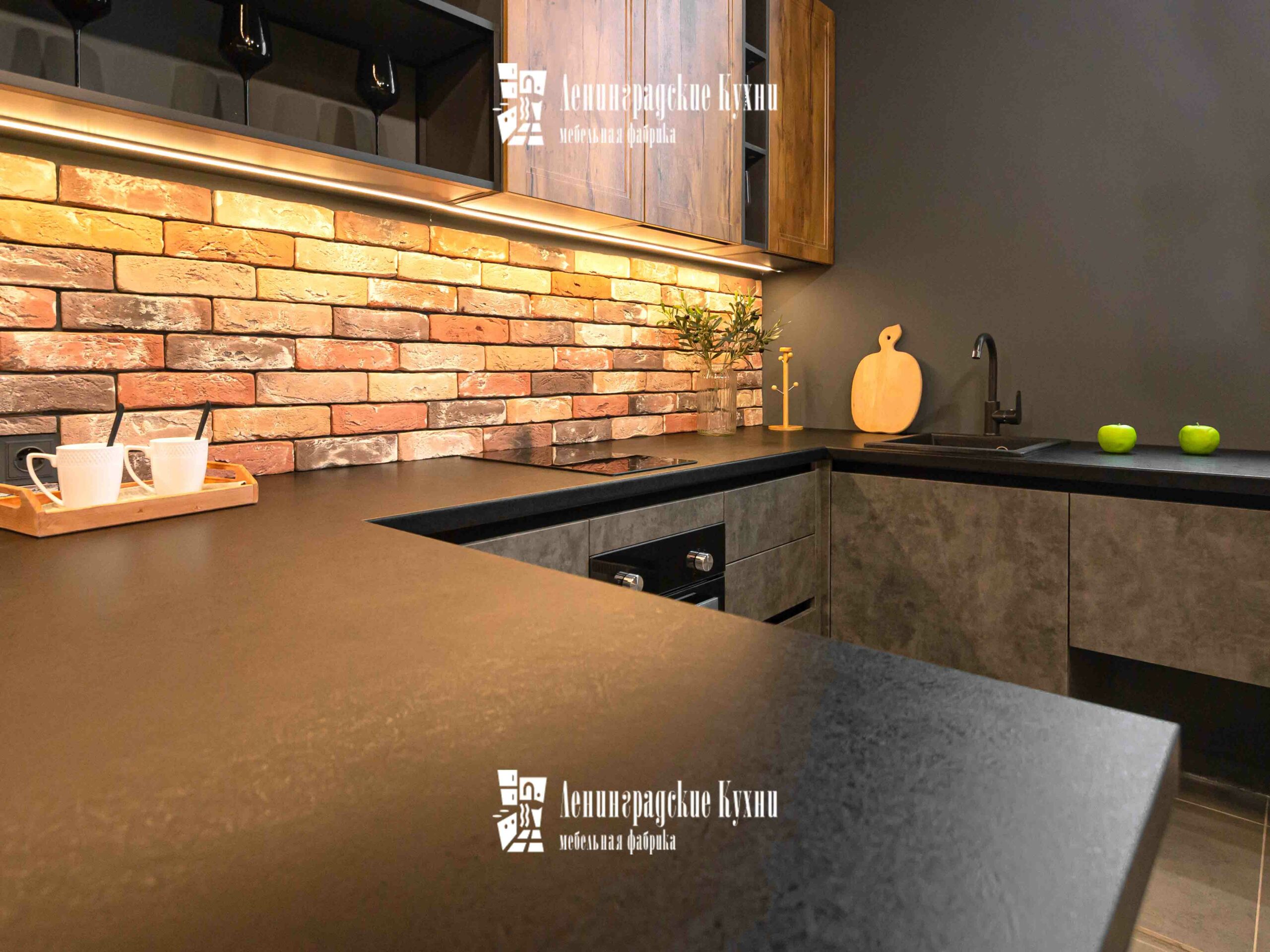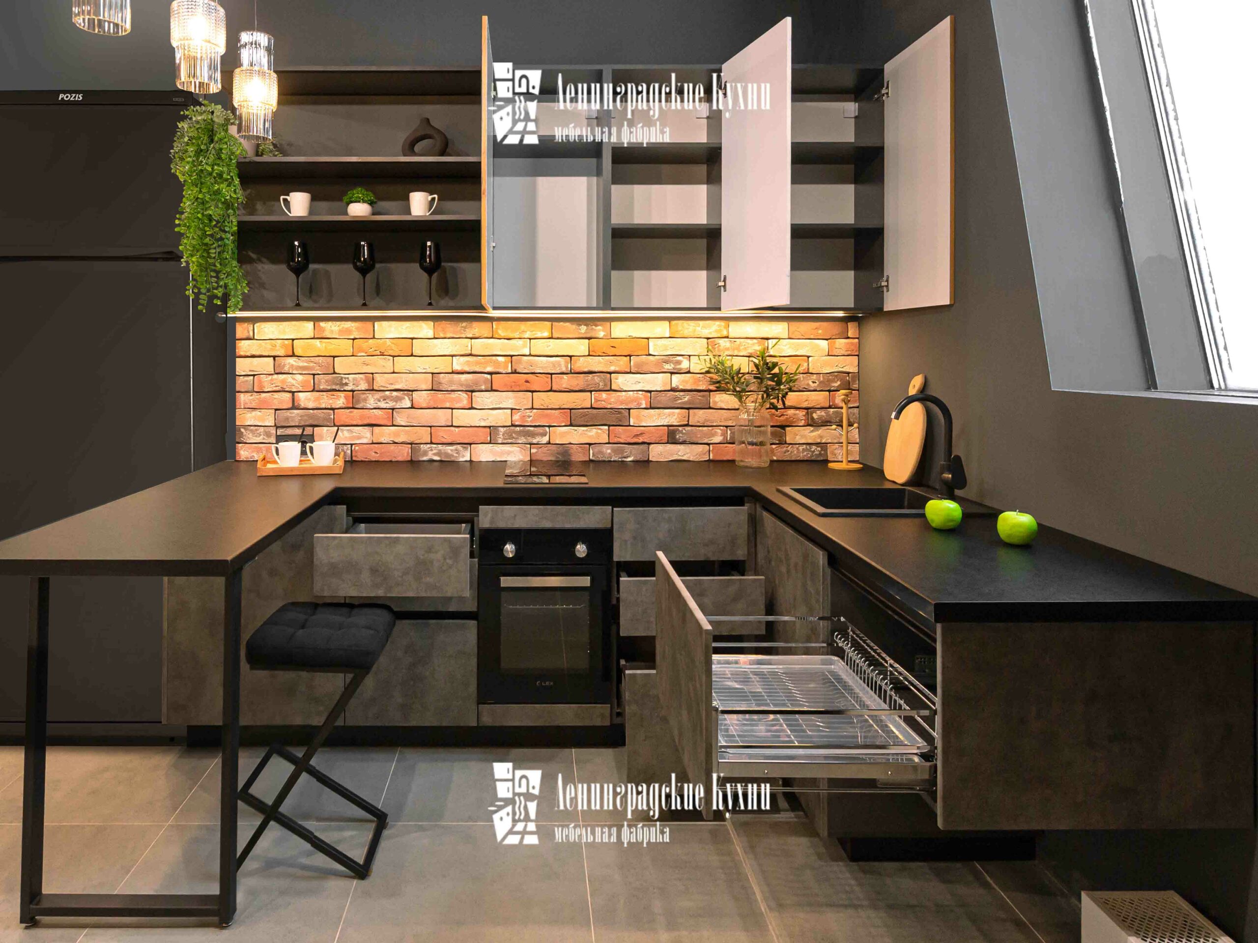 Темные оттенки гарнитура в сочетании с мягким освещением создают атмосферу интимности и сосредоточенности, идеально подходящую для кулинарных экспериментов. Просторные столешницы предоставляют достаточно места для приготовления пищи, позволяя легко разложить все необходимые ингредиенты и кухонные утвари. Удобный обеденный уголок с барными стульями предназначен не только для питания, но и для душевных бесед. Это место, где можно начать день с ароматного завтрака, перезарядиться в обеденный перерыв и закончить вечер за ужином с семьей.