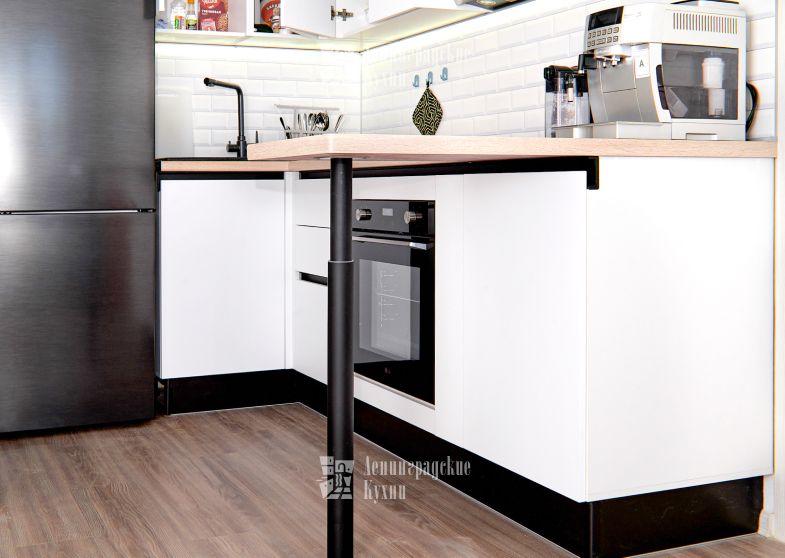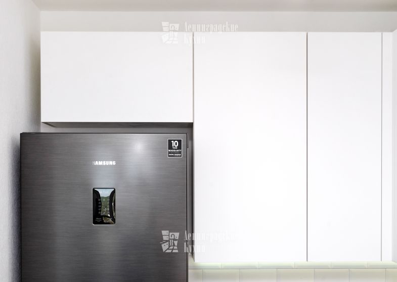 Барная стойка освобождает пространство от громоздкого обеденного стола, а белые матовые фасады без ручек вносят в кухню нотку минимализма.