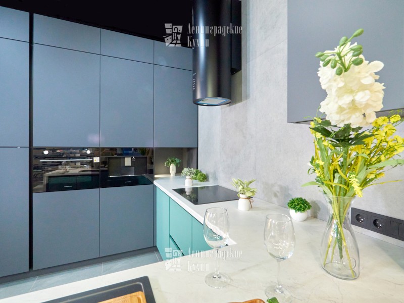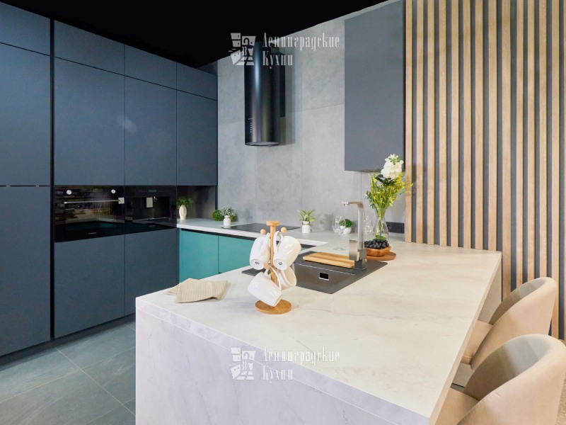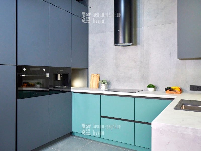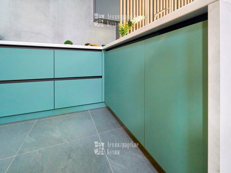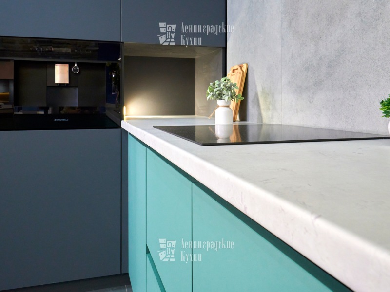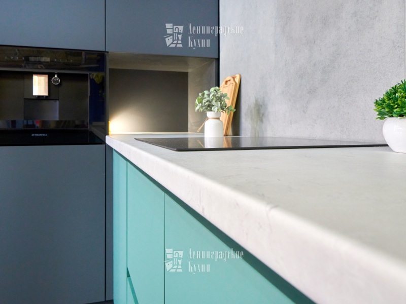 Выполненная в п-образной форме, что позволяет максимально использовать пространство кухни и создать уютную атмосферу. Фасады зеленого и серого цвета придают кухне свежесть и легкость, а встроенная техника делает ее более функциональной. Столешница выполнена «под белый мрамор», что добавляет элегантности и изысканности. Медный смеситель создает ощущение надежности и прочности, а интегрированные ручки делают использование кухни еще более удобным.