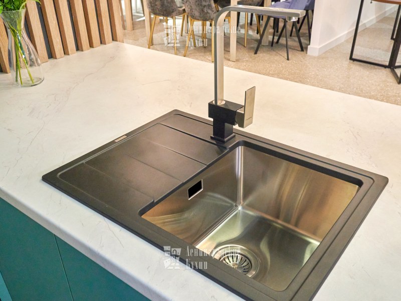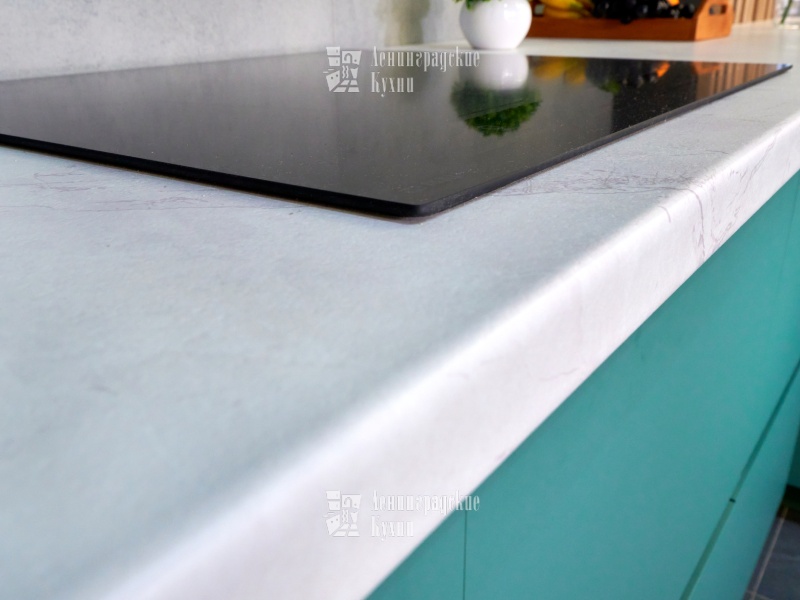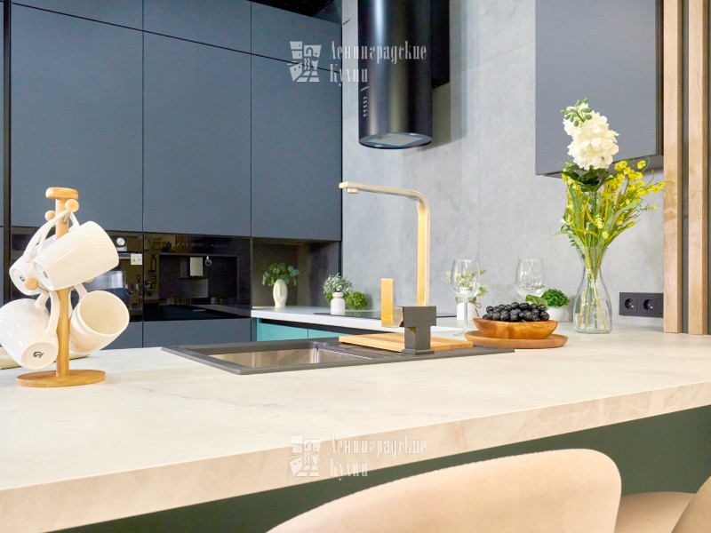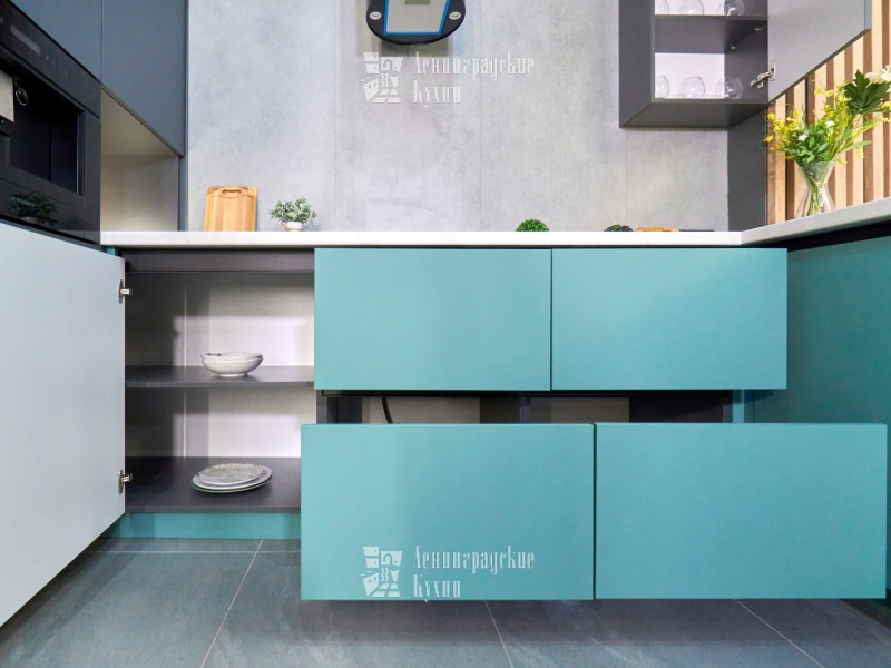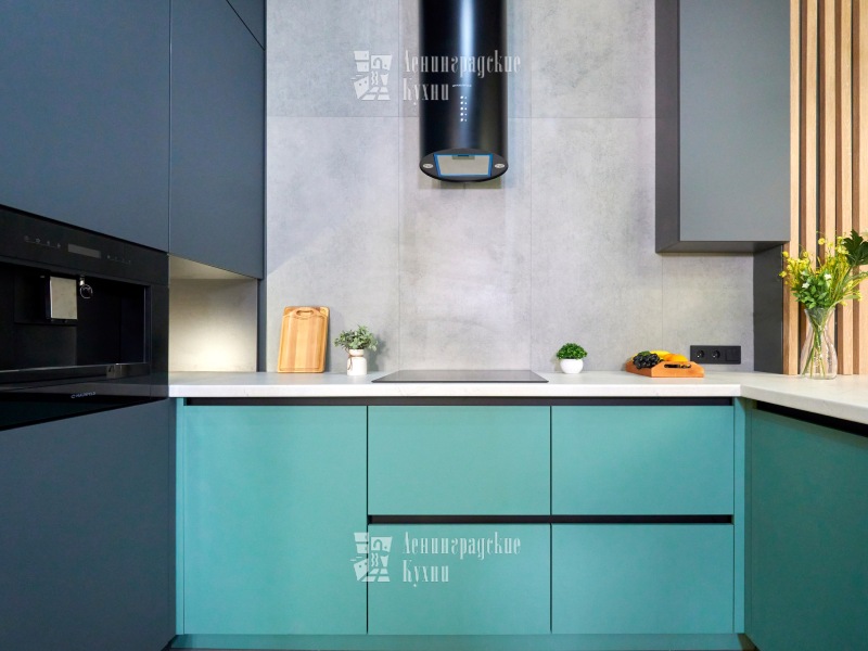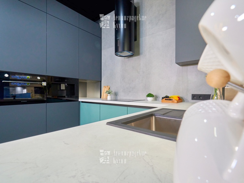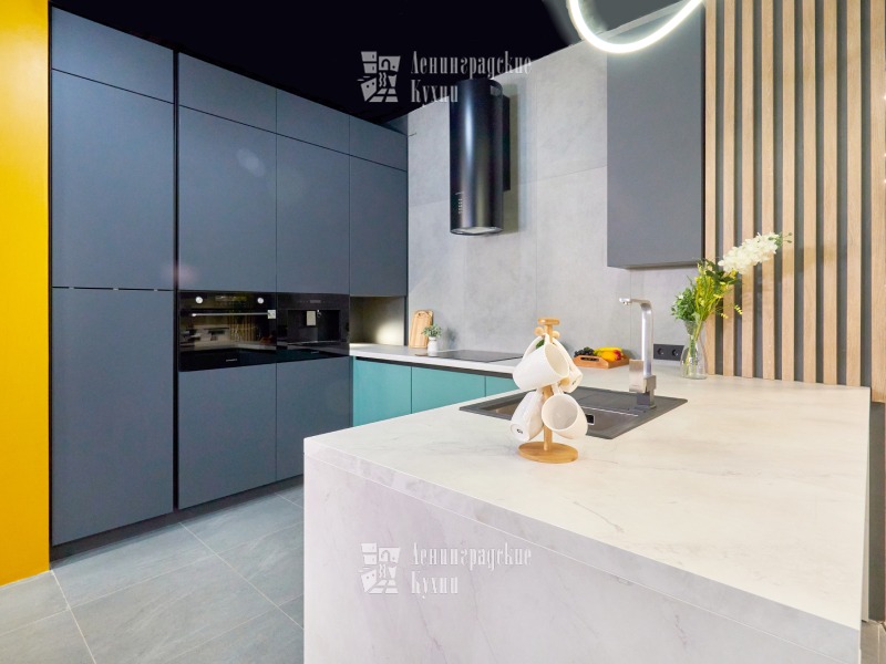 Выполненная в п-образной форме, что позволяет максимально использовать пространство кухни и создать уютную атмосферу. Фасады зеленого и серого цвета придают кухне свежесть и легкость, а встроенная техника делает ее более функциональной. Столешница выполнена «под белый мрамор», что добавляет элегантности и изысканности. Медный смеситель создает ощущение надежности и прочности, а интегрированные ручки делают использование кухни еще более удобным.