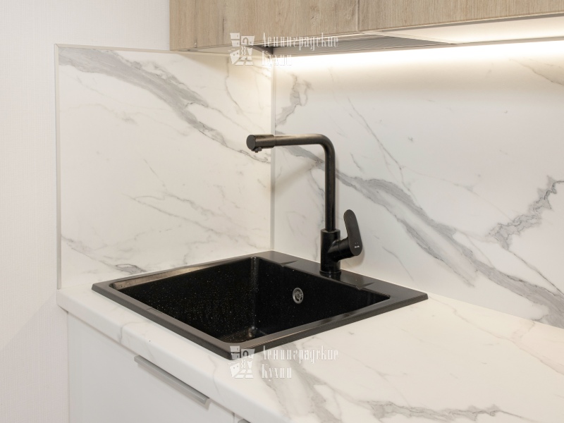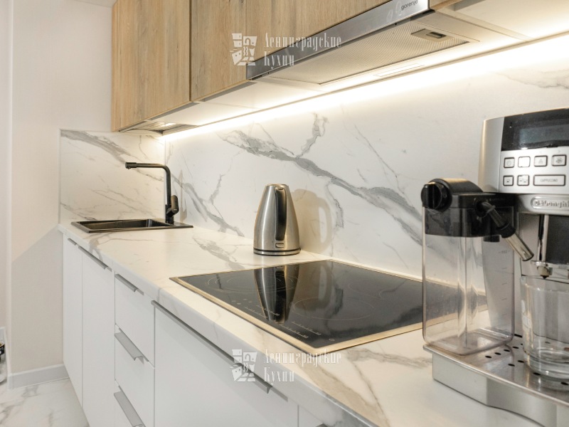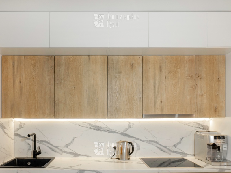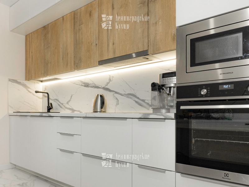 Фасады нижнего и верхнего уровня выполнены в белом цвете, что придает кухне свежесть и чистоту. Средний уровень фасадов привлекает внимание своим уникальным дизайном под дерево, сочетая в себе элегантность и теплоту. Фартук и столешница выполнены под мрамор, что подчеркивает изысканность и роскошь этого гарнитура.