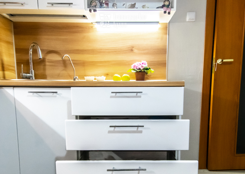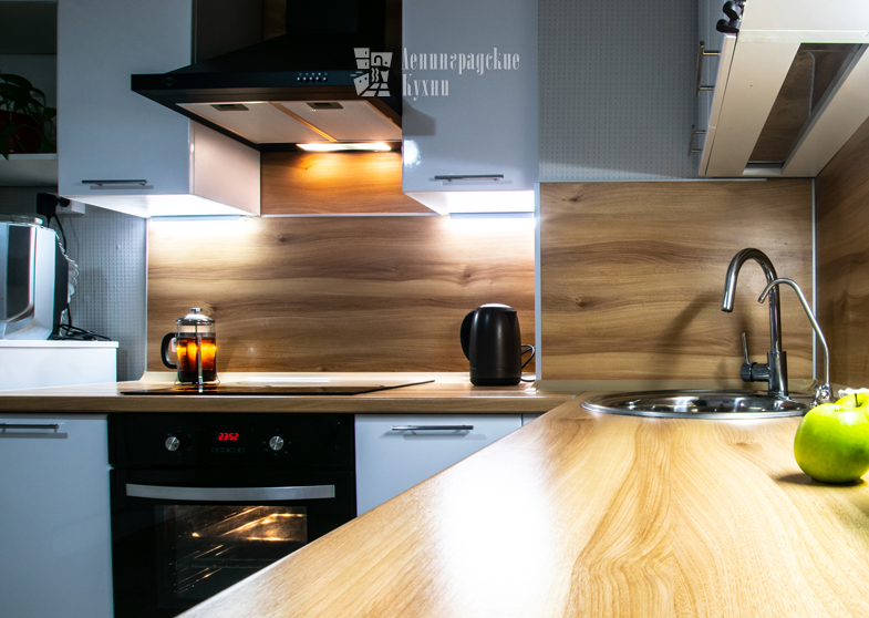 Белый цвет кухни можно разбавить практически любыми тонами, чтобы она заиграла абсолютно по новому, как например, со столешницей под дерево.