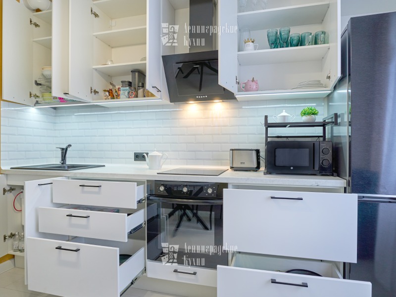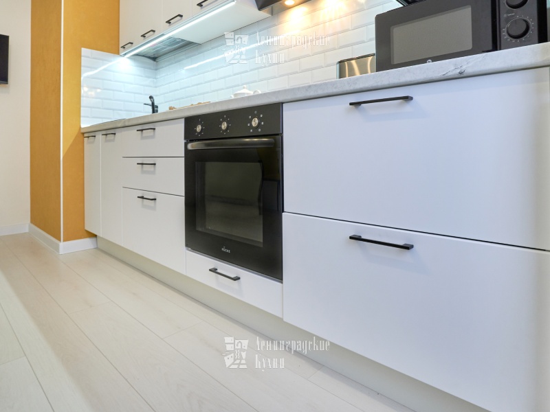 Он выполнен в минималистичном стиле с использованием качественных материалов и технологий. Прямая проектировка кухни создает ощущение простора и легкости. Белые фасады гармонично сочетаются со столешницей из искусственного мрамора, придавая кухне свежий и элегантный вид. Встроенная техника позволяет максимально использовать пространство и делает готовку проще и удобнее. Ручки-скобы придают кухне особый шарм и делают ее еще более привлекательной.