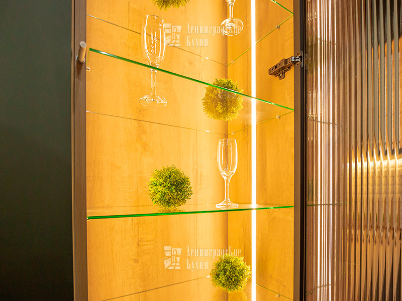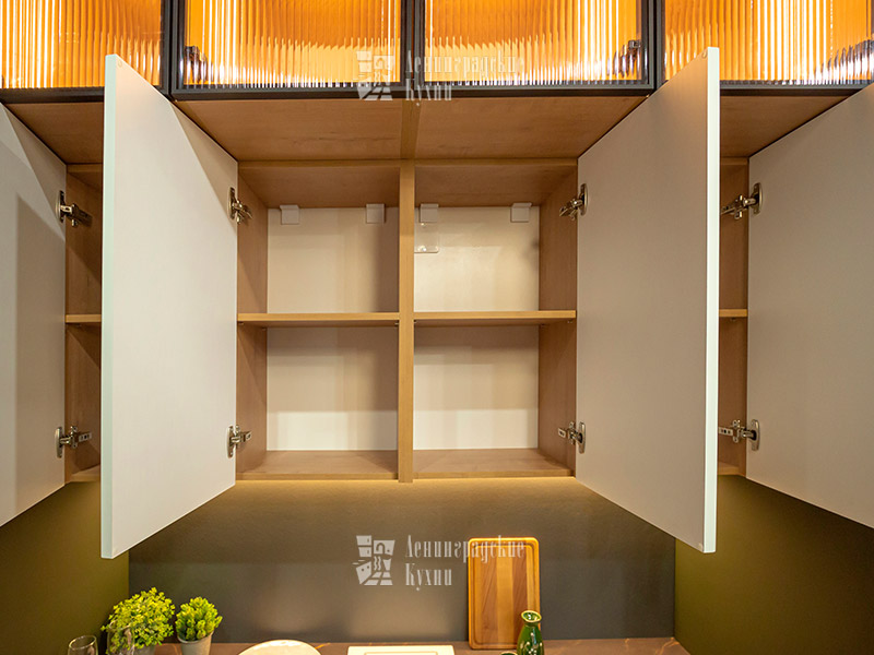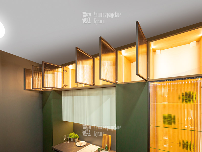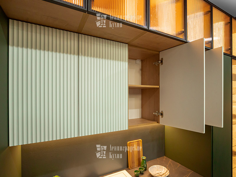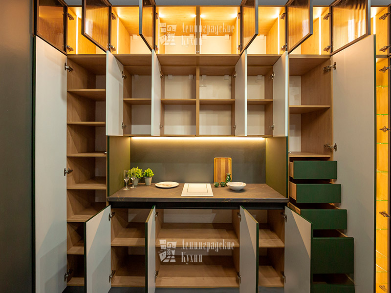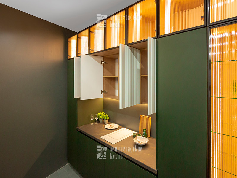 Этот гарнитур представлен в виде большой прямой кухни под потолок, с отдельным островком для приготовления пищи. Он создает ощущение тропического дождя, где каждая деталь напоминает о природе и красоте.