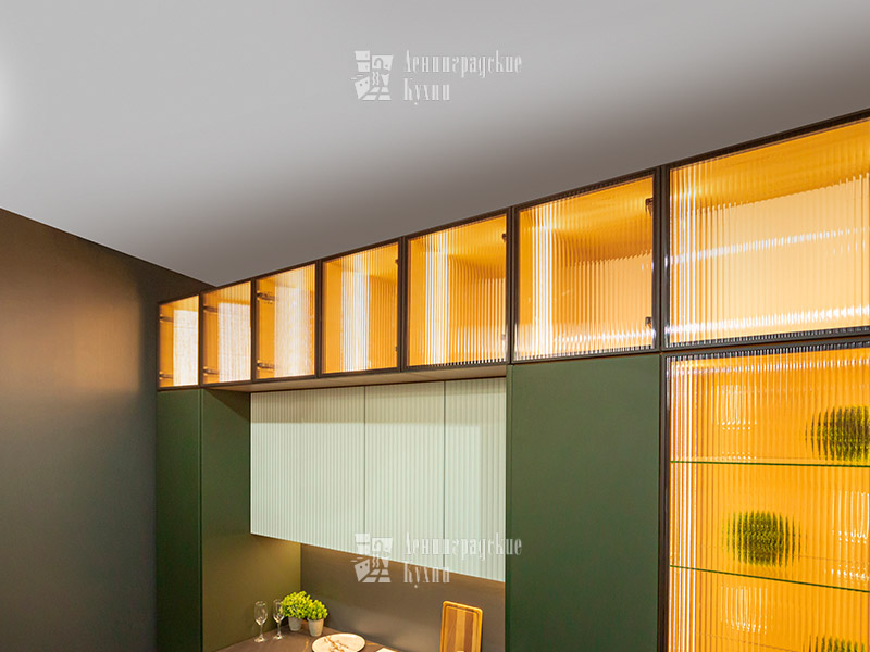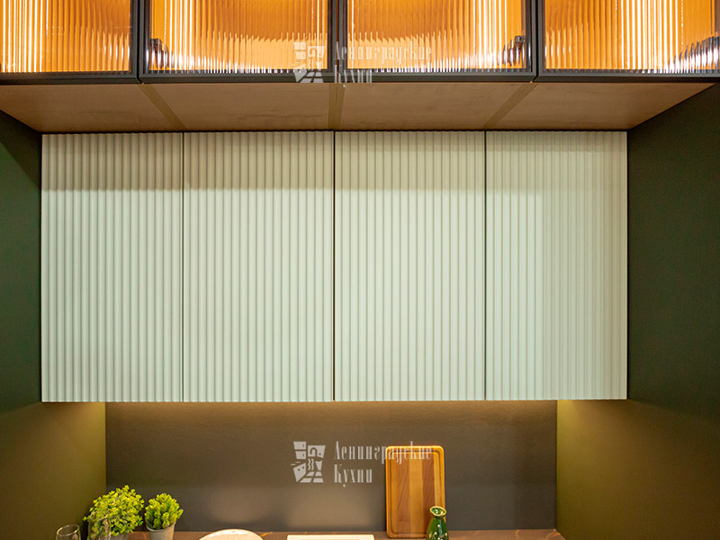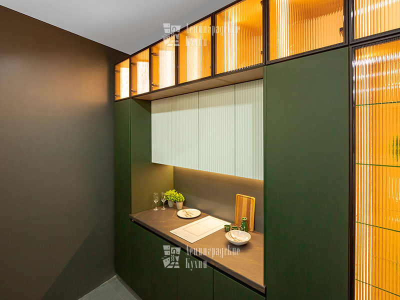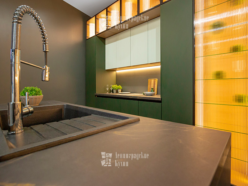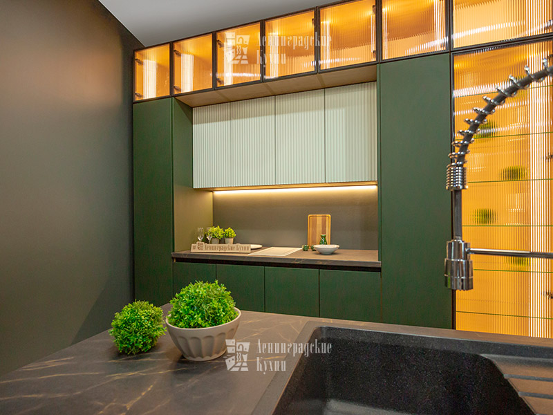 Кухонный гарнитур «Тропикана» — это настоящее воплощение тропической атмосферы в вашей кухне! Он выполнен в сочетании белых, темно-зелёных и стеклянных фасадов, деревянного каркаса и черной столешницы «под мрамор».