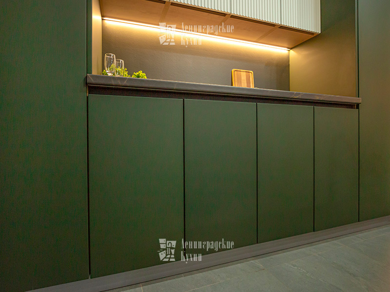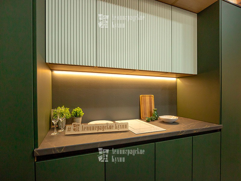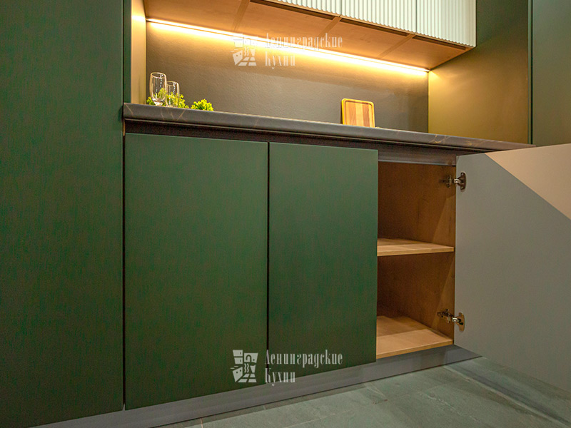 Белые фасады создают ощущение чистоты и свежести, а темно-зеленые добавляют глубину и насыщенность. Стеклянные дверцы и открытые полки позволяют видеть все необходимые кухонные принадлежности, а деревянный каркас придает уют и теплоту. Черная столешница под мрамор придает элегантность и стиль, а также обеспечивает комфорт во время готовки.