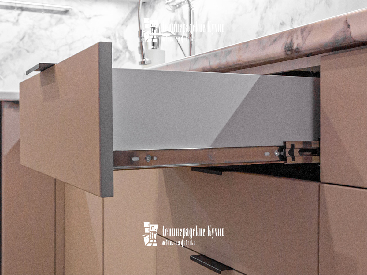 Фасады, выполненные из материала Риолит, создают гармоничный и стильный облик, идеально подходящий для современных интерьеров. Гарнитур выполнен в серых тонах, что придаёт кухне сдержанность и изысканность. Отсутствие антресолей и других декоративных элементов подчеркивает минималистичный стиль, делая пространство более открытым и просторным.
