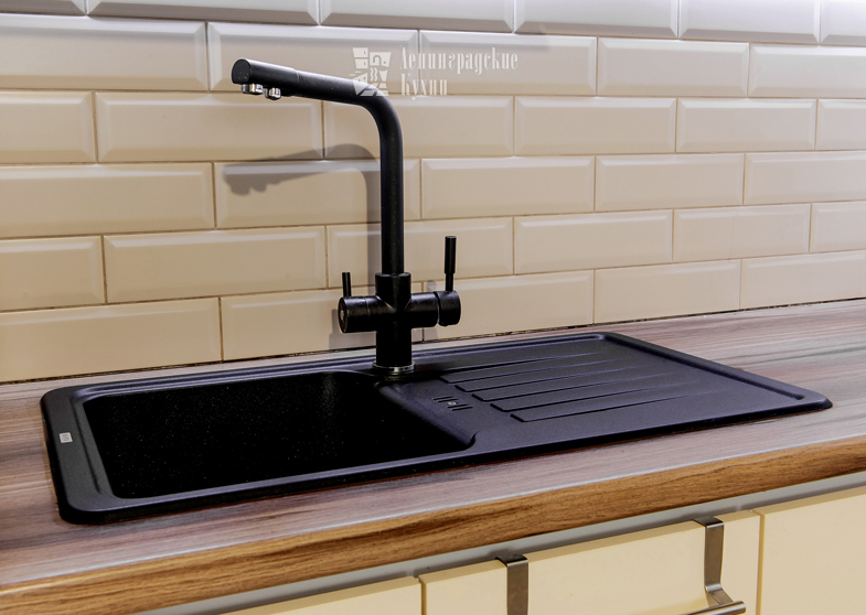 Теплый отблеск фасадов в кремовых тонах, чарующий и контрастирующий с ними древесный декор столешницы и барной стойки, имитирующей старинный дубовый стол.